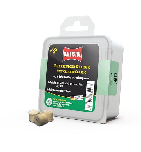 Ballistol Filzreiniger Klassik sind die schonende Alternative zu Renigungsbürsten oder Patches. Sie sind frei von chemischen Substanzen und reinigen ohne Füll- und Hilfsstoffe die Läufe Ihrer Waffen. Die Filzreiniger sind formstabil und dennoch elastisch, was beste Reinigungsergebnisse selbst im Kantenbereich der Züge und Felder ermöglicht. Außerdem eignen sich die Reiniger gut als Träger für Öl, Laufreiniger oder -pasten. Gefertigt aus 100 % Schafwolle.