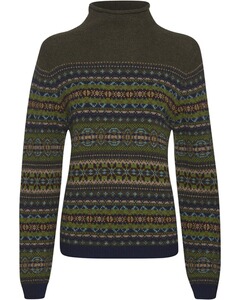 Der Damen Stehkragen-Pullover Kinross von Eribé ist ein bequemer Begleiter, der durch eine festere Strickart angenehme Wärme bietet. Der hohe Kragen steht elegant vom Hals ab und kann je nach Vorliebe nach innen oder außen umgeschlagen werden. Das romantische Fai Isle Muster, das an den Schultern endet, setzt einen modernen Akzent und sorgt für eine schmeichelhafte Silhouette. Die Säume sind mit einem kleinen Rippenstrick versehen, was dem Design eine ansprechende Struktur verleiht. Hergestellt aus feiner Merino-Lammwolle, bietet der Pullover nicht nur ein angenehmes Tragegefühl, sondern auch eine hochwertige Verarbeitung „Made in EU“. Mit einer regulären Passform ist der Kinross die ideale Wahl für Damen, die Wert auf stilvolle und komfortable Mode legen. Für einen lässigeren Oversized-Look empfiehlt es sich, eine Größe größer zu wählen.