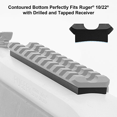 Schiene mit Picatinny-Profil passend für Ruger 10/22. Die aus hochwertigem Flugzeugaluminium präzise gefräste Schiene besitzt 11 Querrillen. Sie ermöglicht eine variable Befestigung der Zieloptik für den bestmöglichen Augenabstand. Die Schiene ist für mehr Widerstandsfähigkeit mit mattschwarzen Harteloxal überzogen. Lieferung inklusive Befestigungsschrauben.